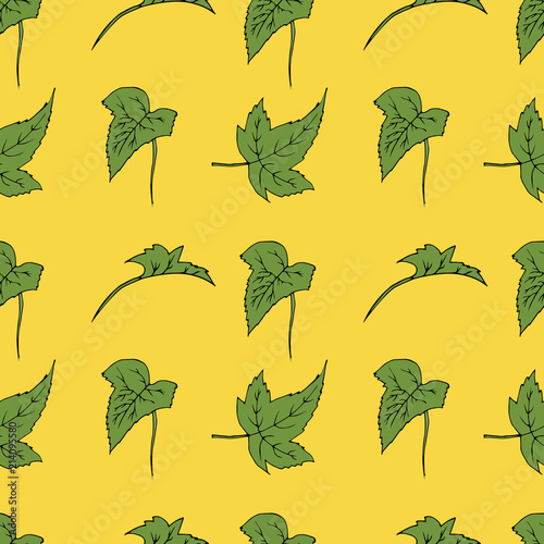 © Екатерина Окунева, Fototapeta premium Seamless texture of green leaves. Hand drawn illustration on yellow background