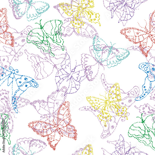 © Ihor, Fototapeta premium Seamless texture with colorful minimalistic butterflies. Illustration with dots, pointillism. Packaging and textile design