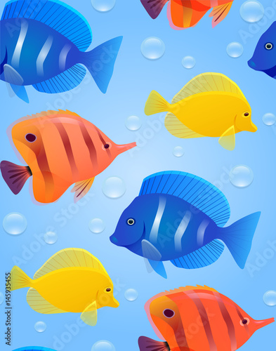 Naklejka premium Seamless texture with sea tropical fish and bubbles. Vector bright pattern for wrapping paper, wallpaper and your design