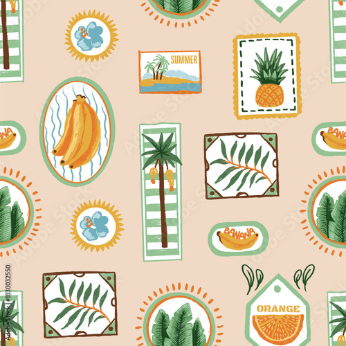 Obraz premium Seamless tropic fruits vector pattern with summer labels, palm trees and decorative frames