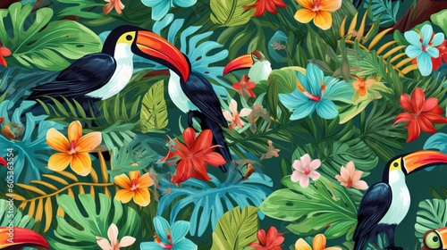 © Jardel Bassi, Obraz premium Seamless tropical background with parrots, flowers, and leaves