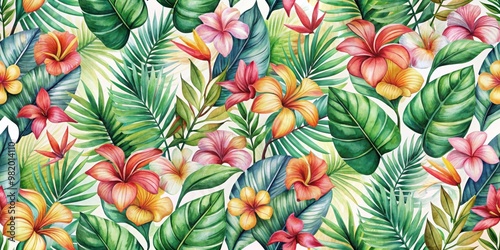 Naklejka premium Seamless tropical floral pattern with watercolor design, tropical, floral, seamless, pattern, watercolor, vibrant