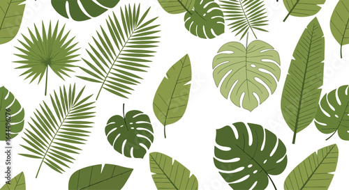 © meeblues, Fototapeta premium Seamless tropical foliage pattern featuring lush green monstera, banana, palm, and fern leaves with subtle pink flowers, creating an exotic botanical design on a clean white background