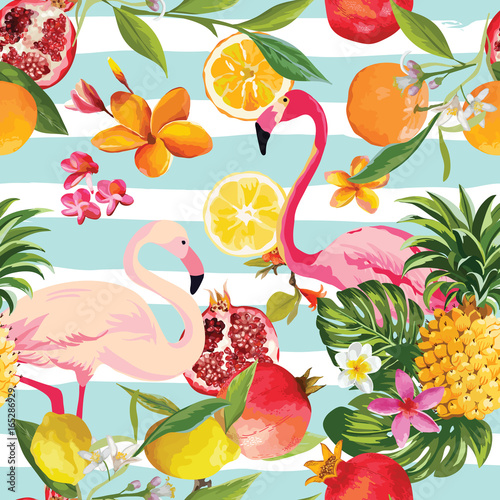 © wooster, Naklejka premium Seamless Tropical Fruits and Flamingo Pattern in Vector. Pomegranate, Lemon, Orange Flowers, Leaves and Fruits Background.