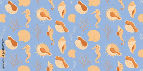 Obraz premium Seamless Tropical Ocean Pattern with Beige Seahorses, Shells, Coral & Marine...