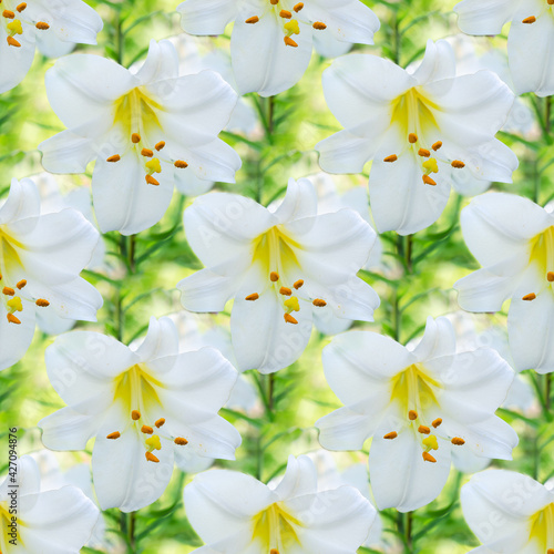Obraz premium Seamless unfocused floral background with beautiful white lilies. Square framing, art design
