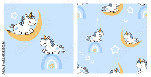 Naklejka premium Seamless unicorn pattern with cute unicorn on crescent moon and rainbow...
