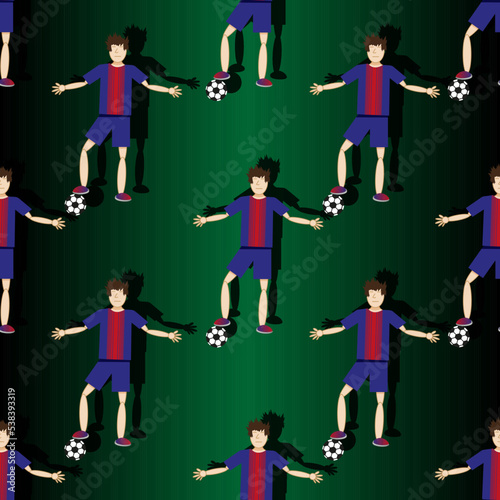 © Olga Igumenova, Fototapeta premium Seamless vector background with soccer players with football ball on green backdrop with shadow. Print for wallpaper children room.