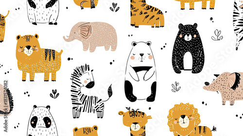© Muhammad, Fototapeta premium Seamless vector cartoon pattern with cute baby zoo animals: lion, giraffe, elephant, tiger, and zebra set illustration for jungle safari collection drawing
