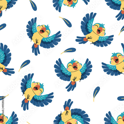 © Alena, Fototapeta premium Seamless vector pattern. Cute happy parrot and feathers on white background. Vector illustration