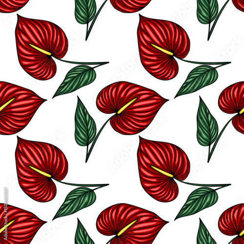 Obraz premium Seamless vector pattern of vibrant red Anthurium flowers and green leaves, a...