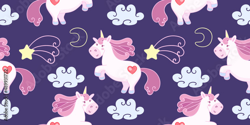 Obraz premium Seamless vector pattern with cartoon unicorn, clouds and moon. Magic...