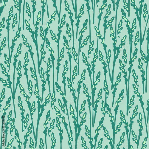 © Randmaart, Naklejka premium Seamless vector pattern with grass meadow texture on blue background. Simple summer nature wallpaper design. Decorative rye field fashion textile.