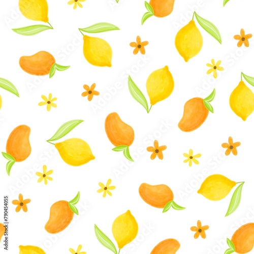 Obraz premium Seamless vector pattern with lemons, kiwi, greens, mango, blueberry, mint, daronia fruit, flowers and geometric stripes.
