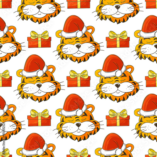Obraz premium Seamless vector pattern with tigers heads in New Year's hats, gifts. 2022. Can be used for fabric, packaging