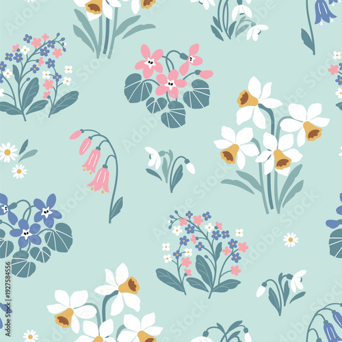 © MirabellePrint, Obraz premium Seamless vector pattern with tiny spring flowers. Hand drawn floral design on isolated background. Perfect for textile, wallpaper or nursery print design.