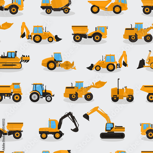 © daudau992, Fototapeta premium Seamless vector pattern with work machines and equipment on a light background.