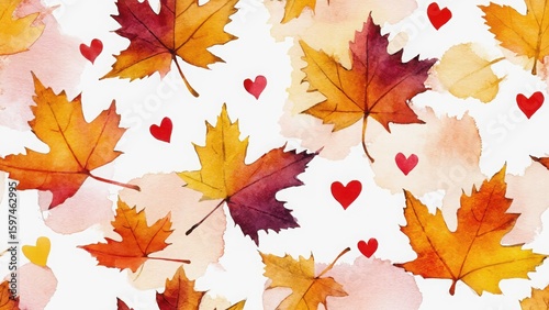 © Anastasiia, Fototapeta premium seamless watercolor autumn leaves and hearts pattern