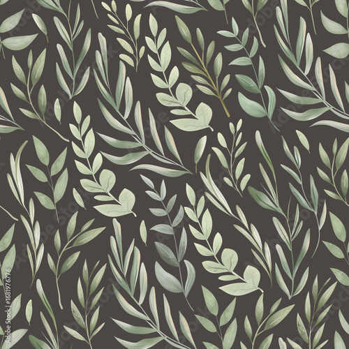 © Anna Druzhkova, Naklejka premium Seamless watercolor botanical pattern with green leaves and branches on dark background. Elegant foliage design for fabric, wrapping paper, wallpaper, and natural-themed decor.