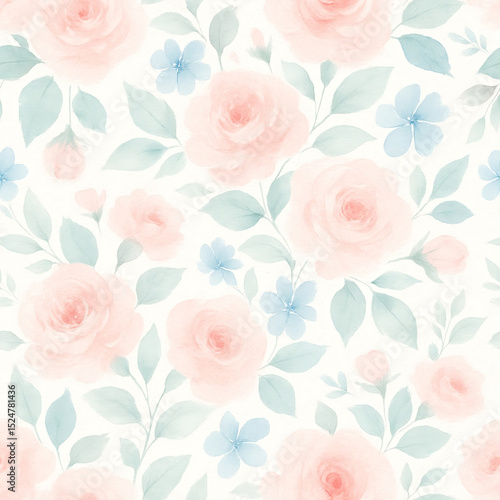 Fototapeta premium Seamless Watercolor Floral Pattern with Pastel Roses and Leaves