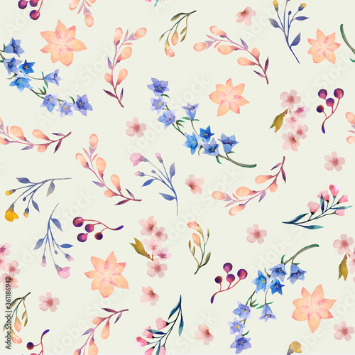 © Marina, Fototapeta premium Seamless watercolor flower pattern. Delicate botanical design. Light green background