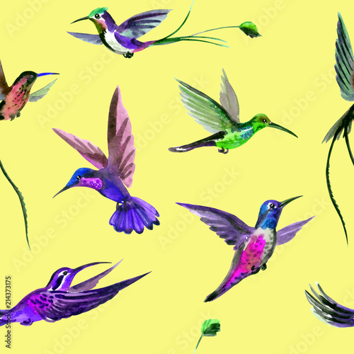 Fototapeta premium Seamless watercolor pattern from multi-colored hummingbirds on a yellow...