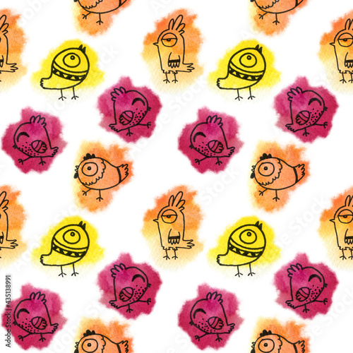 Fototapeta premium seamless watercolor pattern of multicolored doodle birds.