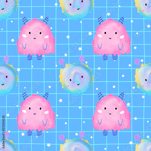 Fototapeta premium Seamless watercolor pattern with fluffy pastel monsters, cute horns, and...