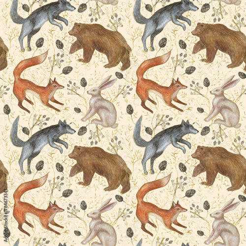 © Nadya Severyanka, Fototapeta premium Seamless watercolor pattern with woodland animals — bear, wolf, fox, and hare among pine cones and forest plants. Hand-painted design perfect for fabrics, wrapping paper, and home decor.