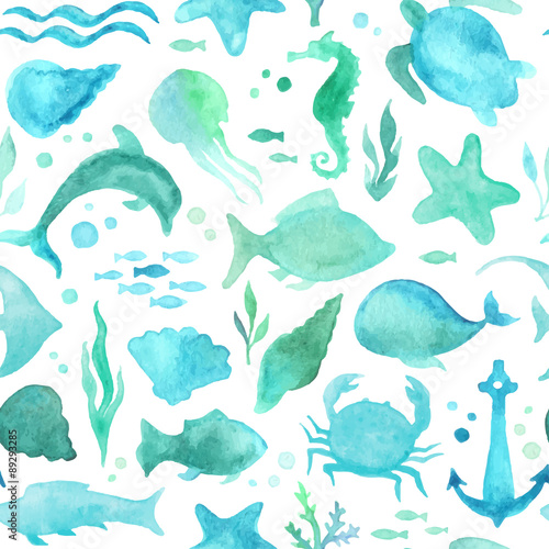 Fototapeta premium Seamless watercolor underwater life pattern.