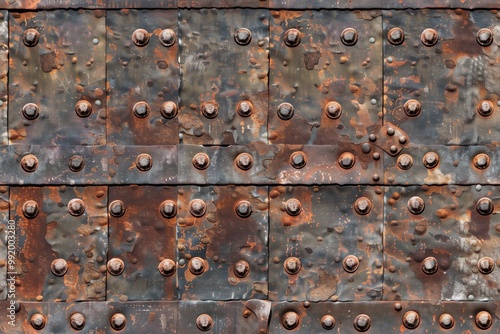 © Aleksander, Fototapeta premium Seamless weathered metal armor surface featuring rusted steel plates joined by rivets. The texture shows signs of corrosion and wear, with a mix of brown and gray tones.