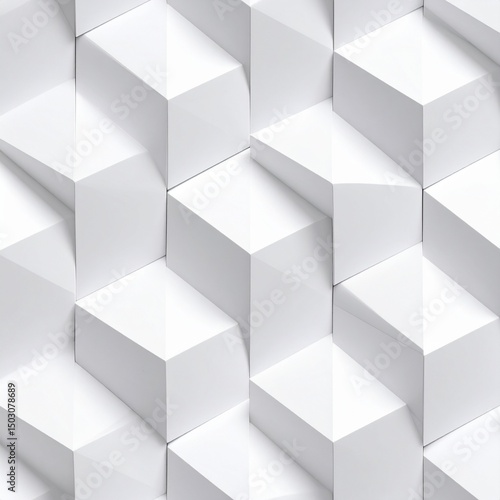 © KAMOLPOP, Obraz premium Seamless White Geometric Pattern Featuring Three-Dimensional Cubes and Pyramids for Modern Design Applications
