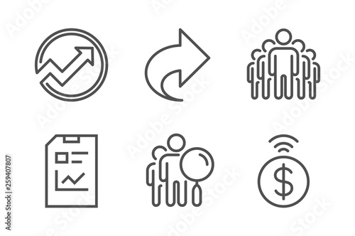 Fototapeta premium Search people, Share and Group icons simple set. Audit, Report document and Contactless payment signs. Find employee, Link. Technology set. Line search people icon. Editable stroke. Vector