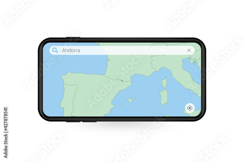Fototapeta premium Searching map of Andorra in Smartphone map application. Map of Andorra in Cell Phone.