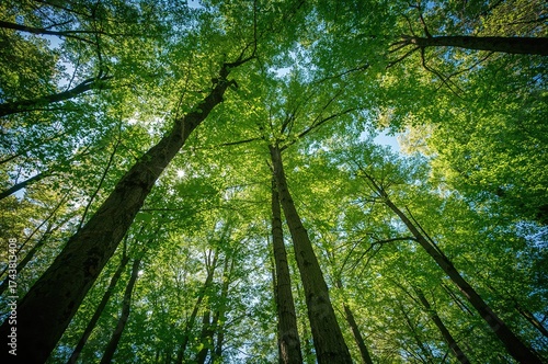 © AkuAku, Obraz premium Searching through lush summer woodland with sunlight filtering through tree trunks under a clear blue sky