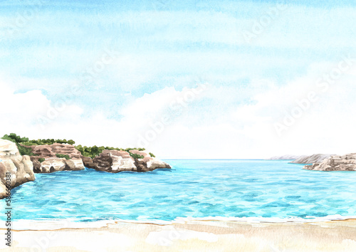 Fototapeta premium Seascape, blue lagoon.Tropical beach with sea and blue sky, summer vacation concept and background. Hand drawn watercolor illustration