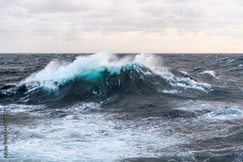 Fototapeta premium Seascape, blue sea. Windy weather. View from vessel. Waves at sea. Storm.