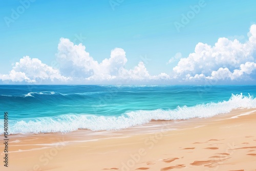 Fototapeta premium Seascape Sandy beach meets turquoise waves under a light blue sky with fluffy clouds