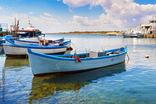 Naklejka premium Seascape with a rowing boats. Bright sunny day. Boat Harbour. Several vintage...