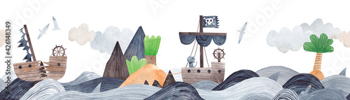 © bukhavets, Naklejka premium Seascape with an island and pirate ships. Watercolor horizontal border. Seamless pattern.