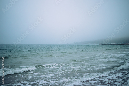 © progressman, Fototapeta premium Seascape with city view in cold misty weather