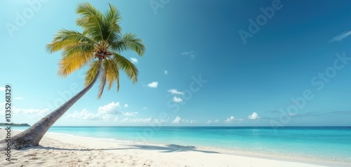 Fototapeta premium Seascape with palm tree on white sand beach, turquoise ocean water, blue sky. Sunny day, tropical paradise, vacation destination. Relaxing tranquil scene on exotic island shore. Shadow on sand.