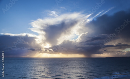 Obraz premium Seascape with sunset rays behind clouds over oce