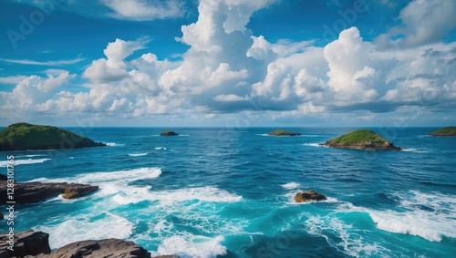 © pngking, Fototapeta premium Seascape with turquoise water, rocky shoreline, small islands, and vibrant clouds under blue sky Copy Space