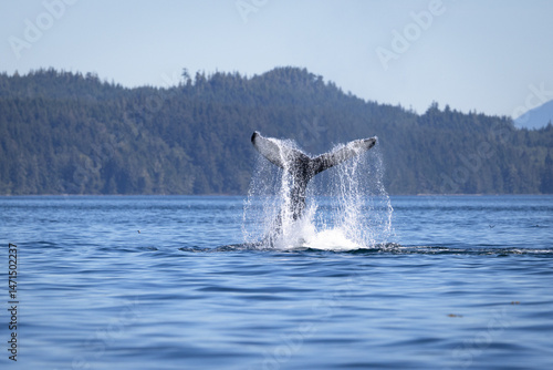 Fototapeta premium Seascape with Whale tail. The humpback whale (Megaptera novaeangliae) tail dripping with water in Knight Inlet, Vancouver Island, BC, Canada.
