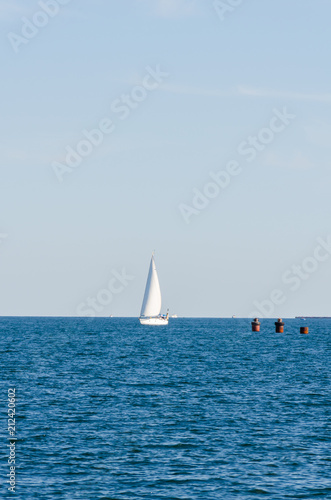 © thaarey1986, Obraz premium Seascape with white yacht on the sea in Odesa