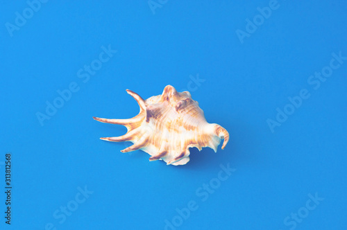 Obraz premium Seashell on blue background. The concept of minimalism. Close-up