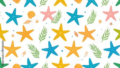 © Bahh, Obraz premium Seashell, starfish, and frond seamless pattern on a white background