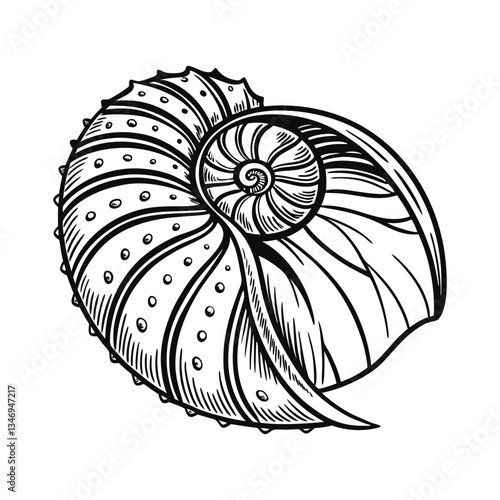 © Mizan, Obraz premium Seashell vector illustration, line drawing style, monochrome design, detailed vector, isolated on a white background