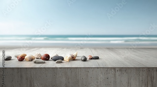 © Yoyo, Obraz premium Seashells And Stones On Grey Concrete Beach Backdrop
